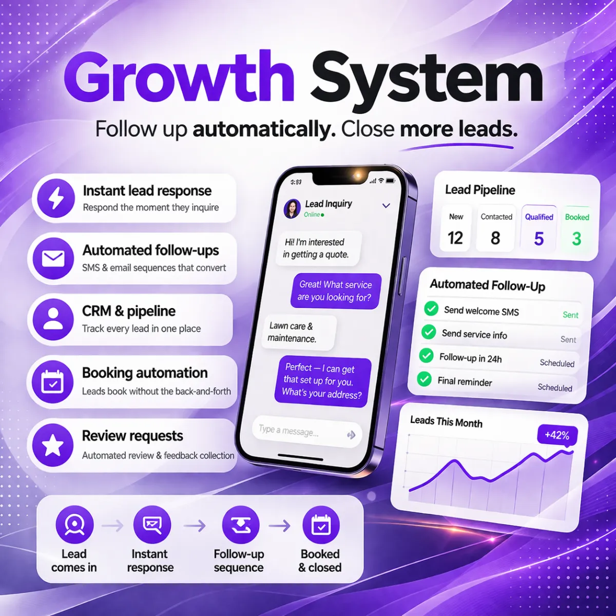 Growth System connects your leads, messages, and marketing into one automated system that responds instantly, stays in touch, and keeps your business top of mind.